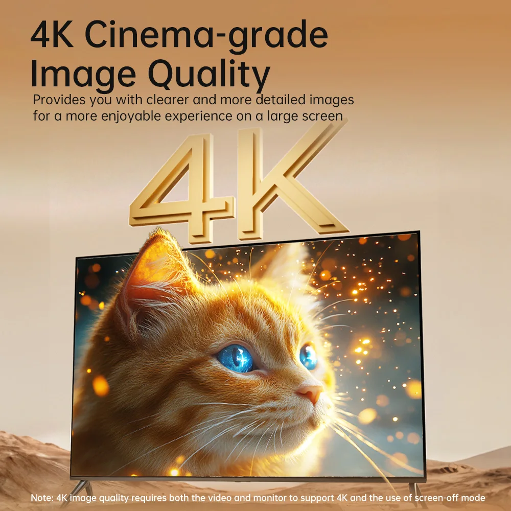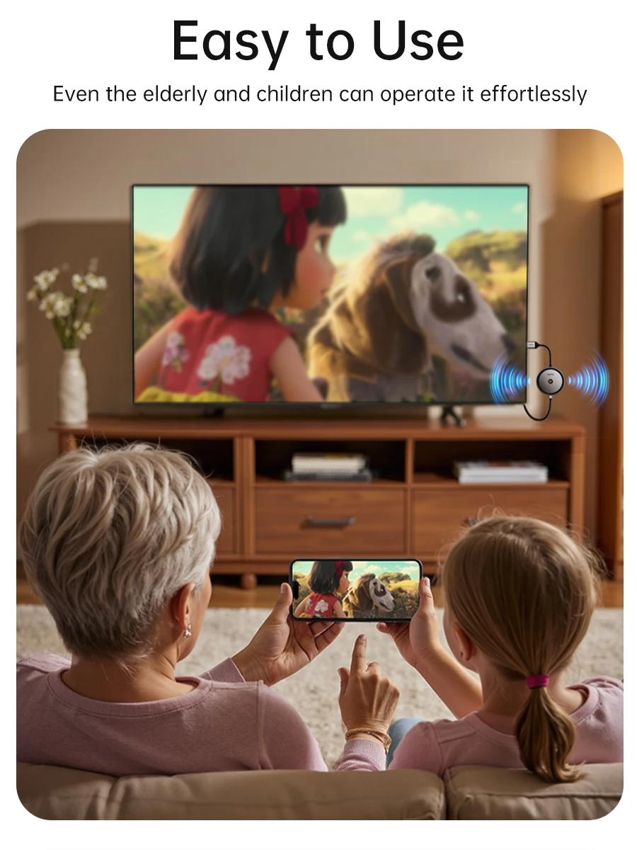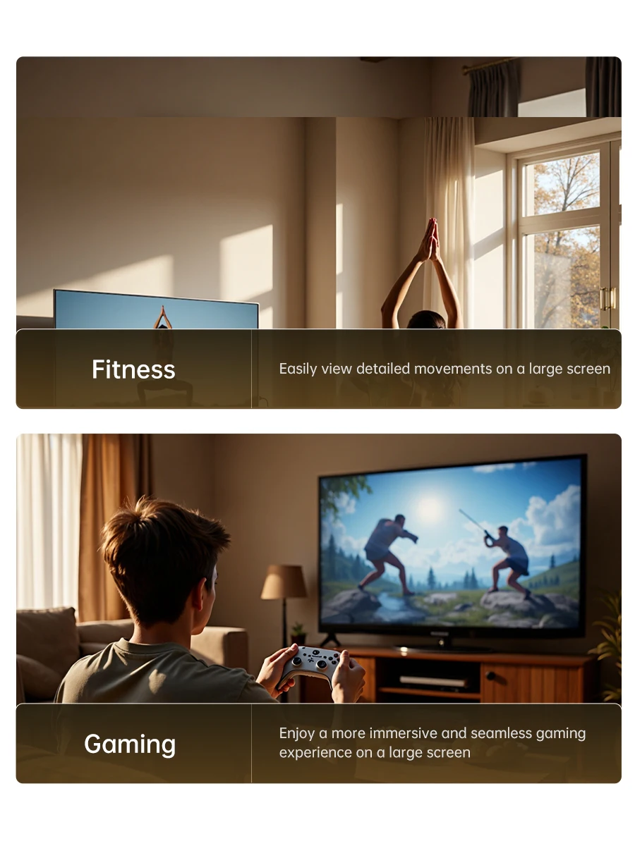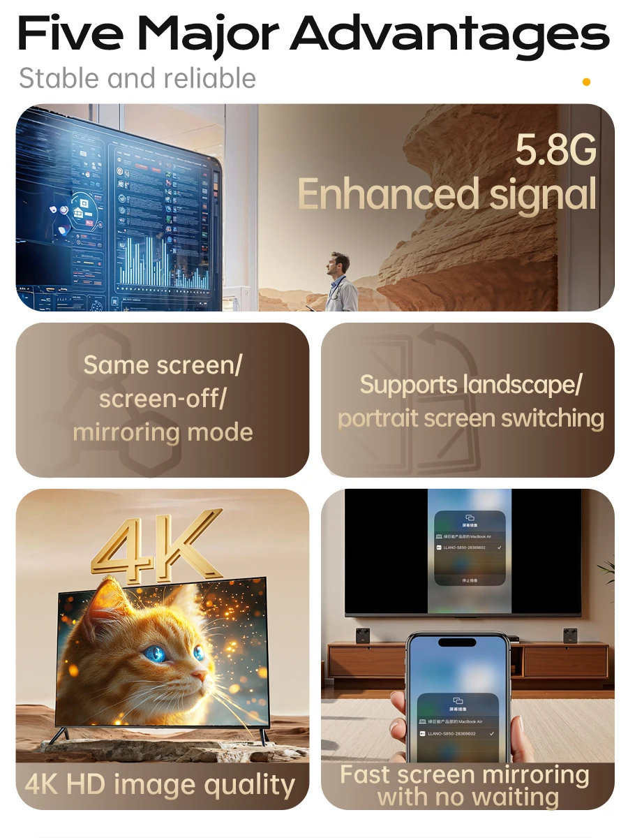 With no app or internet required, you can instantly stream videos, presentations, games, and photos in crystal-clear 4K resolution. The upgraded 5.8GHz wireless signal ensures stable performance with minimal lag, even in environments with multiple devices.
