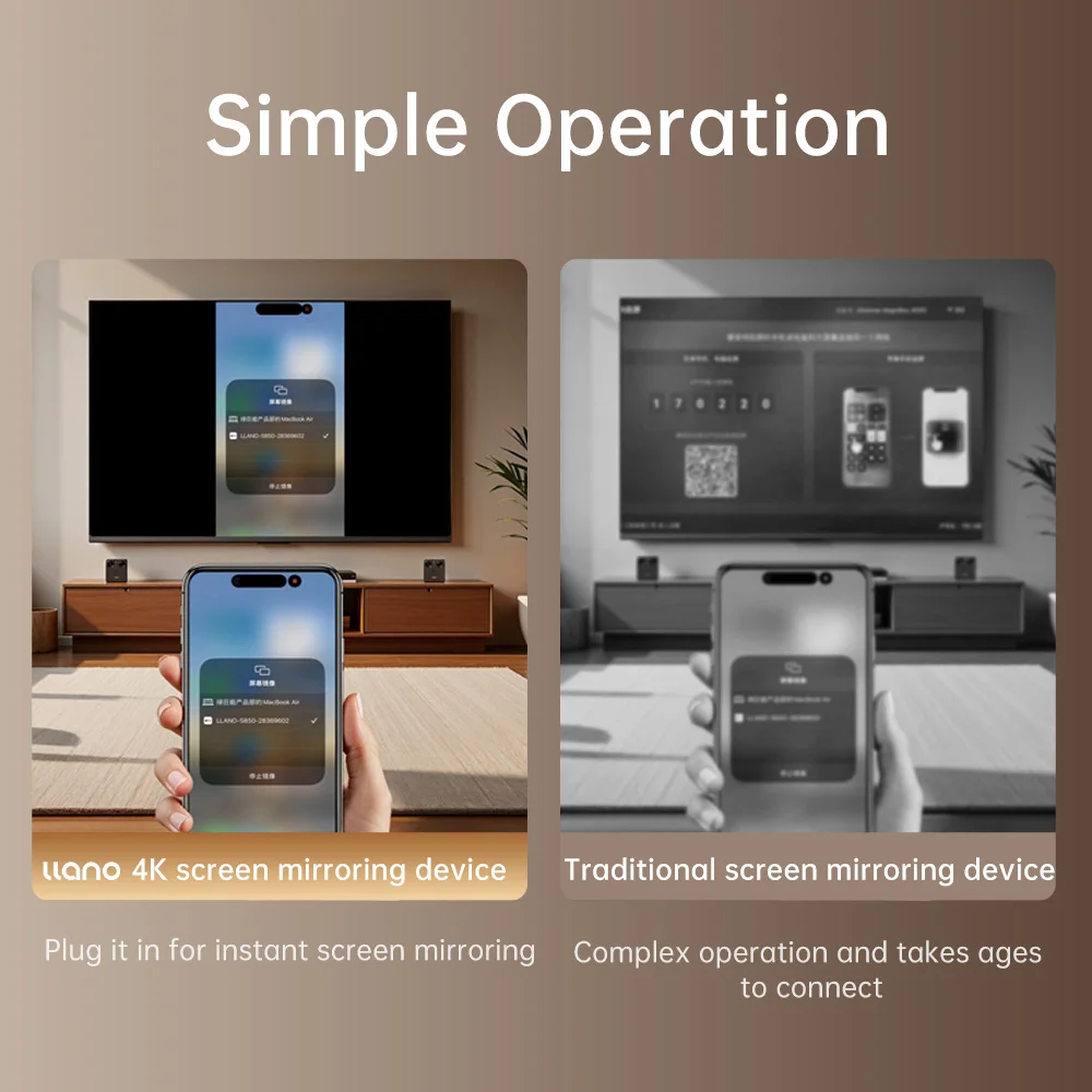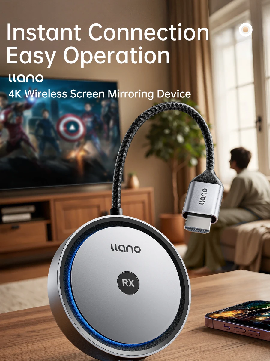 Mirror your phone to TV instantly with the Llano 4K Wireless Screen Mirroring Adapter. Plug & play HDMI display dongle with 5.8G signal, 30m range, and no app required. Perfect for movies, gaming, and presentations.
