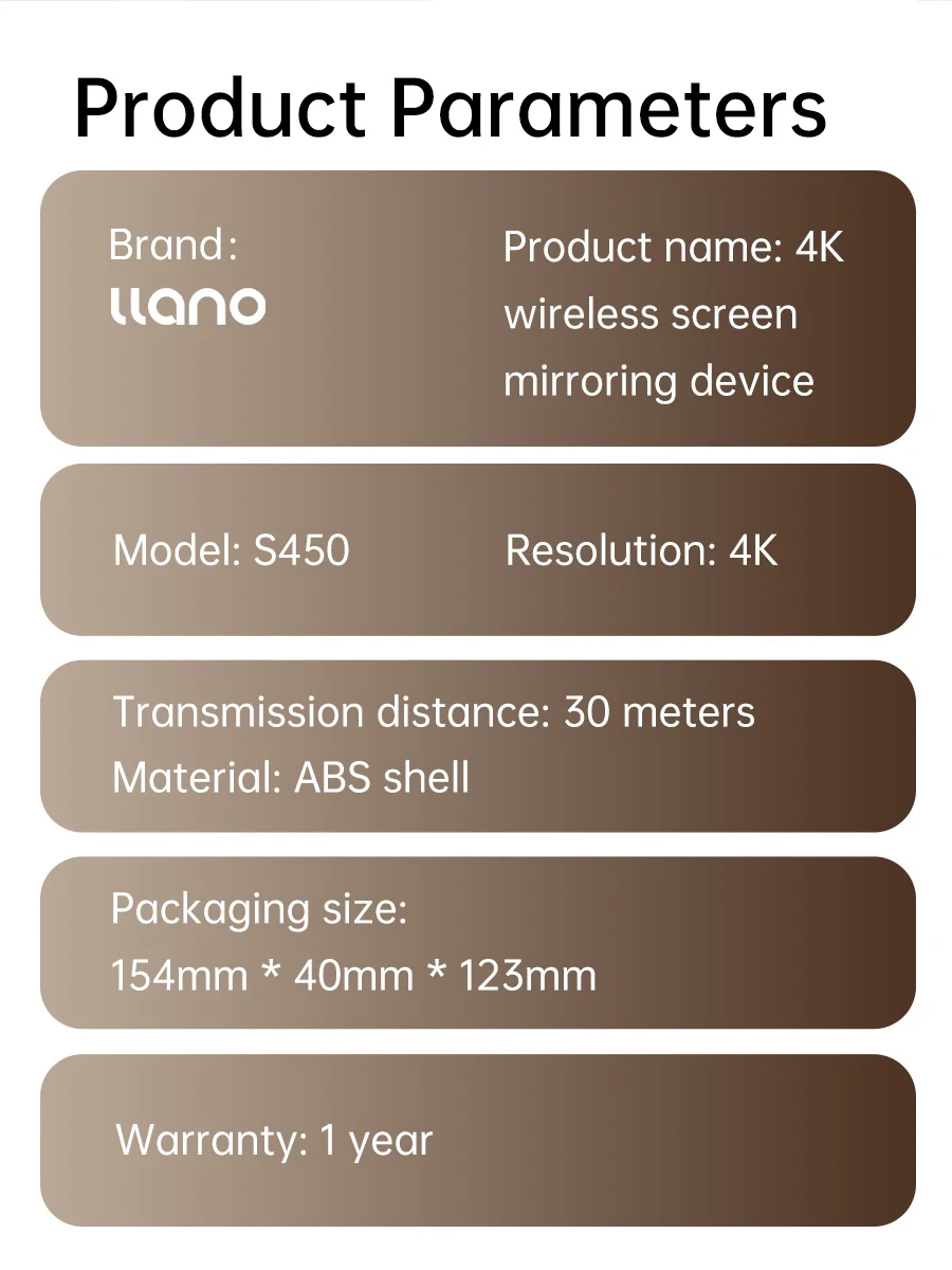 The Llano 4K Wireless Screen Mirroring Adapter is a powerful plug-and-play HDMI display dongle that allows you to wirelessly mirror your smartphone, tablet, or laptop screen directly to your TV, monitor, or projector.